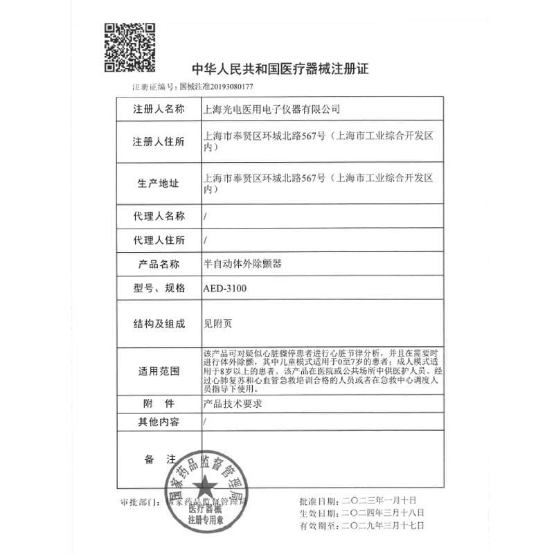 - 产品适用范围:该产品可对疑似心脏骤停患者进行心脏节律分析,并且在需要时进行体外除颤,其中儿童模式适用于0至7岁的患者;成人模式适用于8岁以上的患者。该产品在医院或公共场所中供医护人员、经过心肺复苏和心血管急救培训合格的人员或者在急救中心调度人员指导下使用。