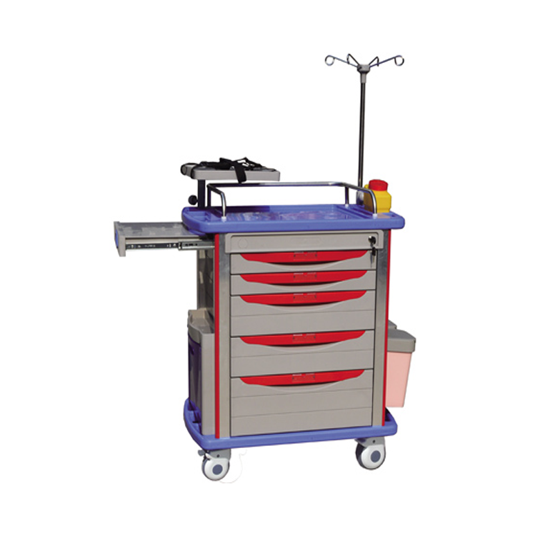 备注:标准配置:四柱承重为铝合金柱,上部:弧形把手,注塑工艺成型ABS工程塑料台面,正反双面板无缝拼接工艺,凹陷设计,嵌软玻璃。304不锈钢护栏。升降输液架带锁螺头,外杆¢25,内杆¢19,4个¢6回旋挂钩。前面:两小抽,两中抽,一大抽。抽屉标识牌插片,标识抽屉内物品。抽屉3*3分隔片,可自由分隔;合理放置物品。抽屉选用三折静音轨道,加中控锁。车体标识,标示使用部门。左面:侧翻档案盒。杂物盒。右面:污物区:锐器盒,两个污物桶。背面无配件。底部:静音脚轮。两个带刹。可选配置:除颤器平台。隐藏式副工作台,5M电源插座,除颤板,氧气瓶支架。
