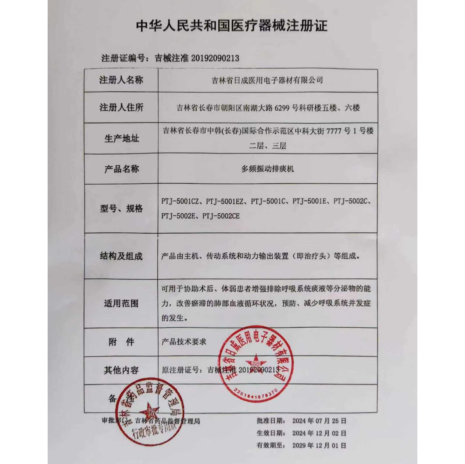 - 产品注册证号:吉械注准20192090213