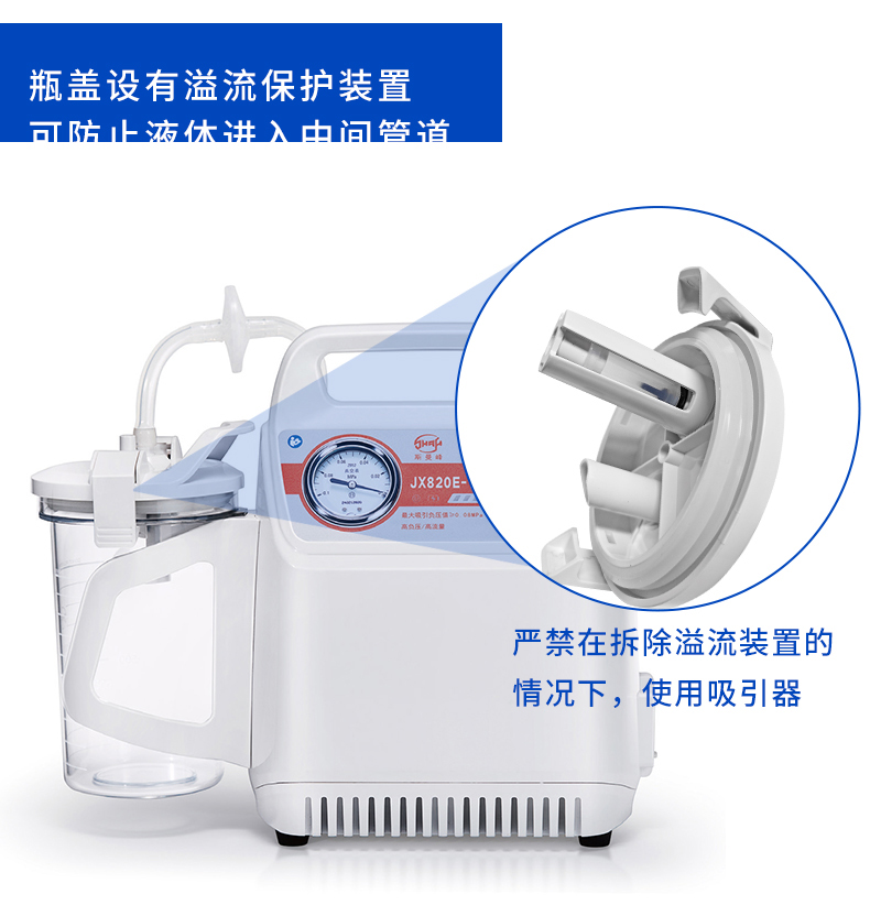 - 上海斯曼峰JX820D型便携式吸引器供麻医疗机构吸出患者上呼吸道中的分泌物,及手术中用于吸引患者各种渗出液、冲洗液,尤其适用于在交通工具上或患者转运途中等缺少交流电源的情况下对病人实施抢救和护理。