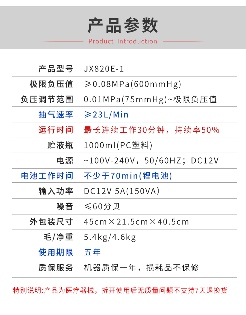 | JX820D-1(锂电池) | 便携式吸引器(一个小时) | ||