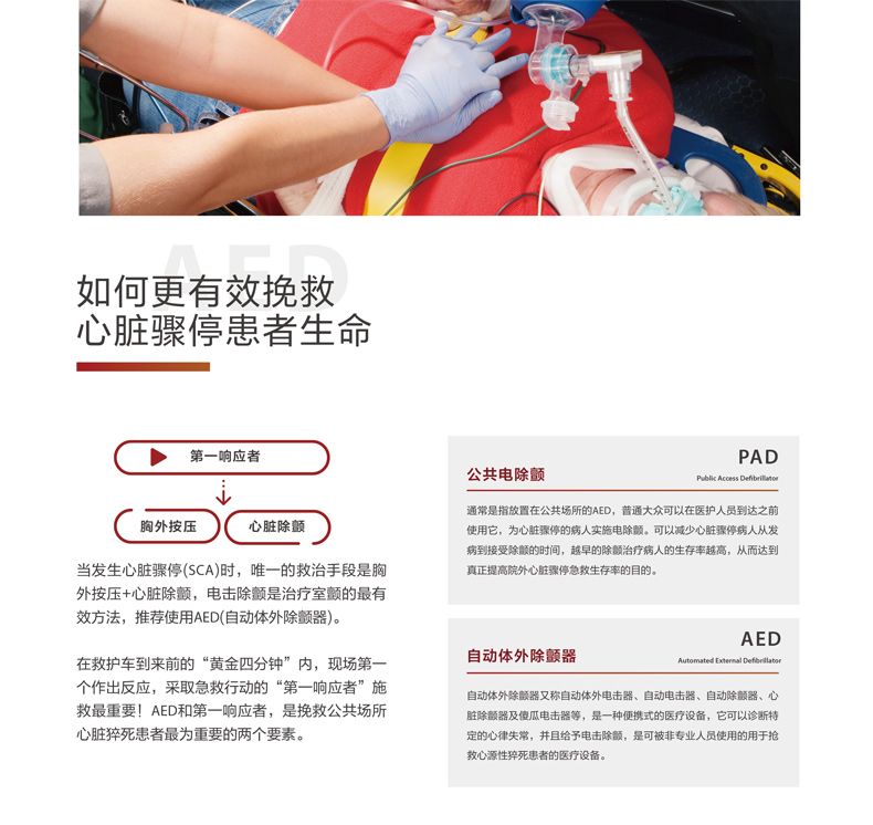 - 在救护车到来前的“黄金四分钟”内,现场作出反应,AED ,是挽救公共场所心脏猝死患者最为重要的两个要素