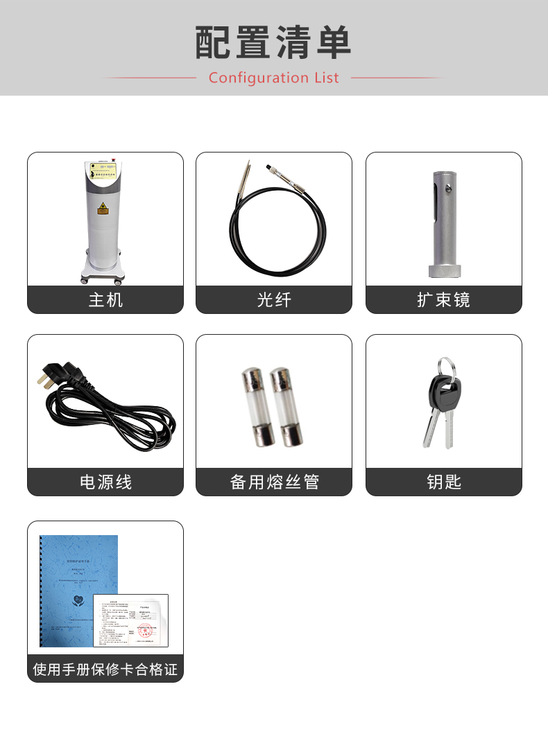 - 产品结构及组成:产品由氦氖激光器、激光电源及控制装置、安全防护装置、光路系统、二分叉光纤组成,含软件组件(发布版本:JGJHR01.00)。
