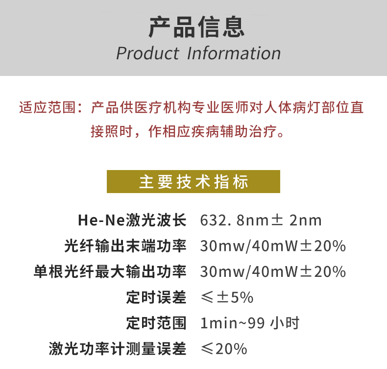 - 产品适用范围:产品供医疗机构专业医师对人体病灶部位直接照射,作相应疾病辅助治疗。