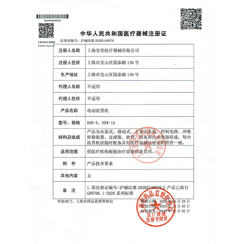 - 产品注册证号:沪械注准20202140576