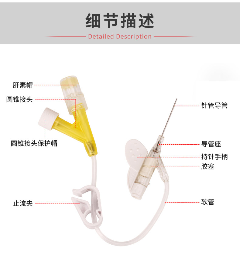 - 产品结构及组成:留置针由导管组件(导管与压套)、导管座、翼片、针管、针座、软管、护套、加药壶、加药壶盖、排气接头、软管、胶塞、止流夹、圆锥接头、圆锥接头保护帽、肝素帽、输液接头、保护壳配件选配组成。经环氧乙烷灭菌。