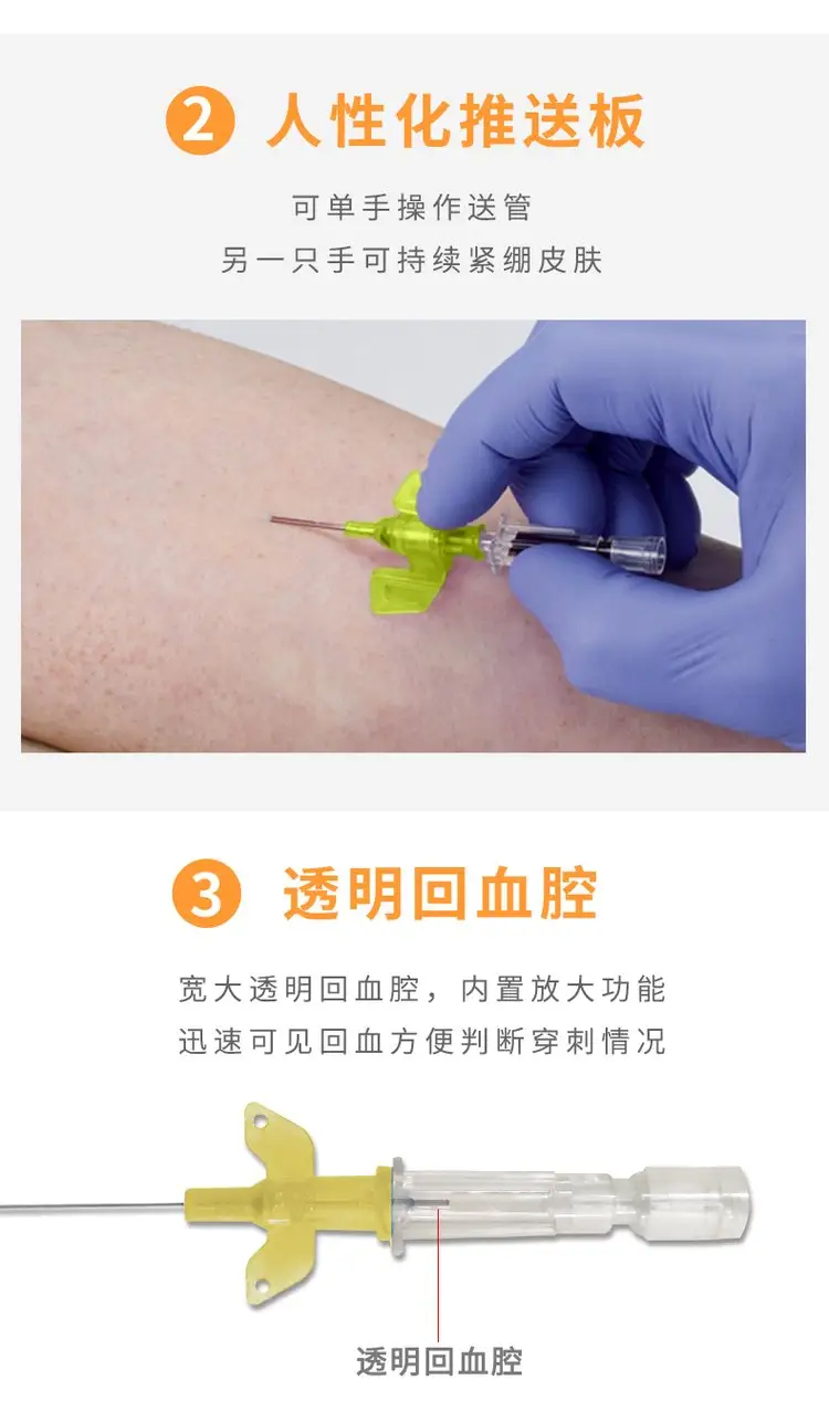 • 拇指和中指固定住。食指推送推送板把导管送入血管